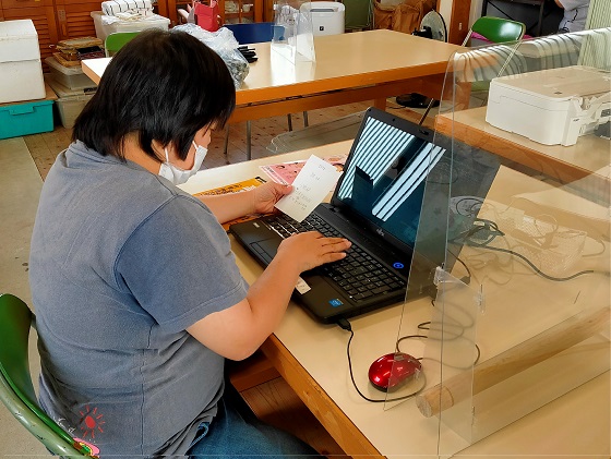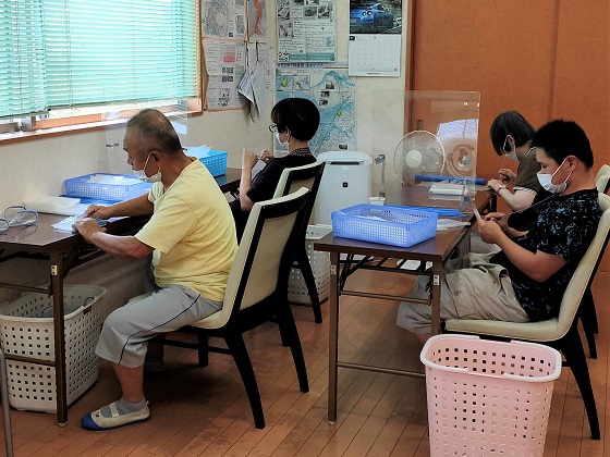 海苔の養殖をするための袋を作っています。袋折り、棒通し、袋丸めなどの作業を行っています。