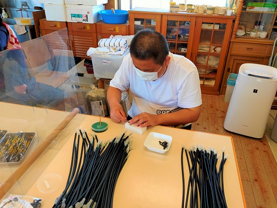 バイクや車に使う電気コードのつなぎ目を高温ドライヤーを使いプラスチックチューブを溶かして補強する作業を行っています。